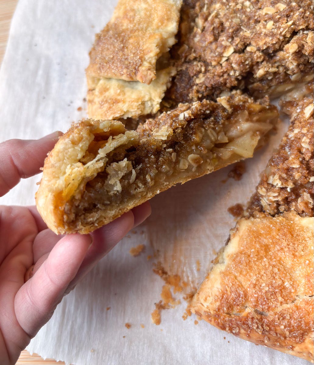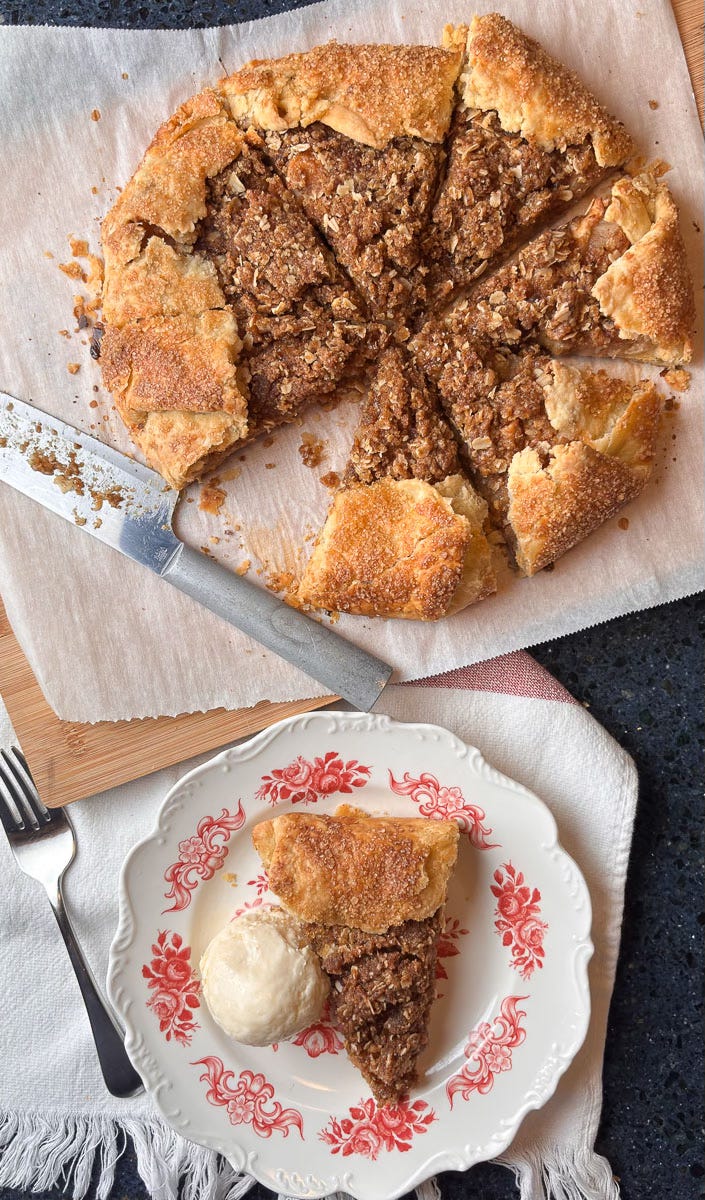 Galette is a rustic free-form pie. No pie dish or fancy crimping is needed—it's free-form pie heaven! When it came out of the oven I controlled my urge to drizzle warm caramel over the top of it. I’m not so sure I will have the self control next time! So without further ado here is the perfect combination of apple crisp and apple pie.